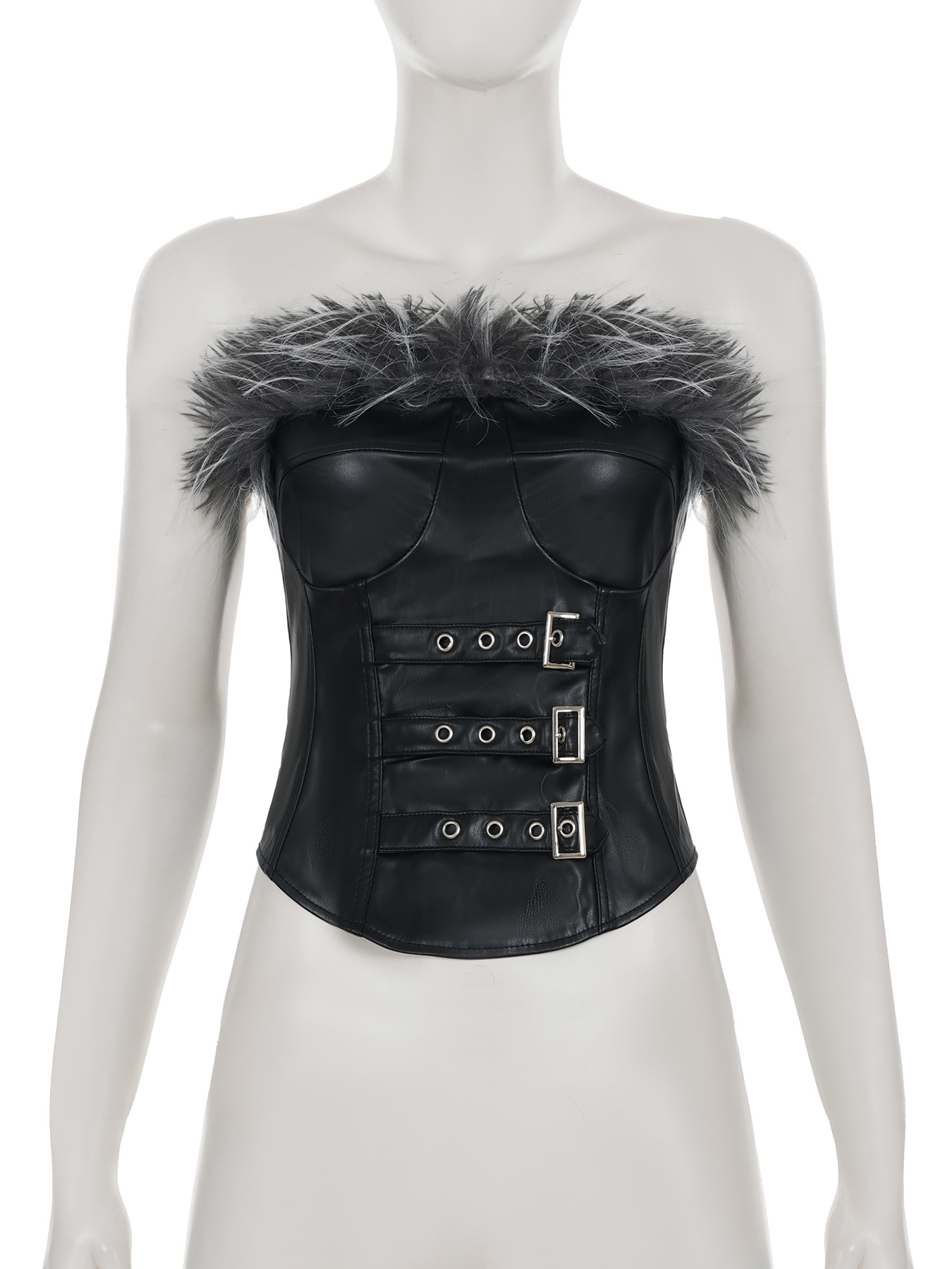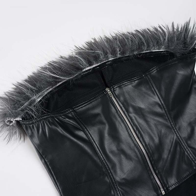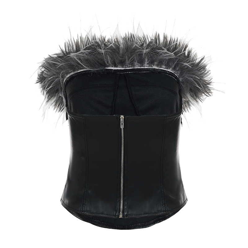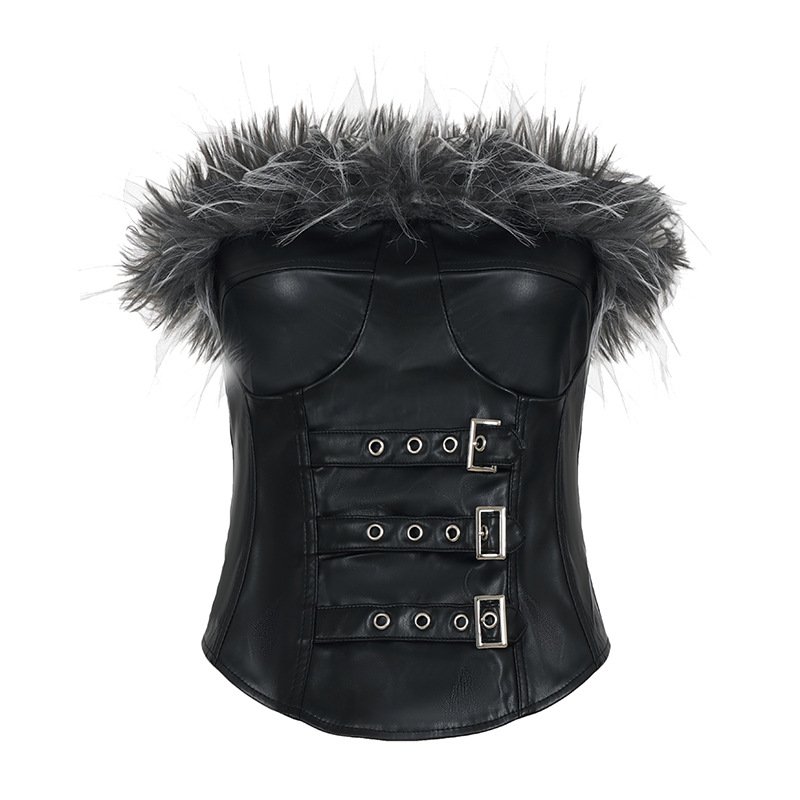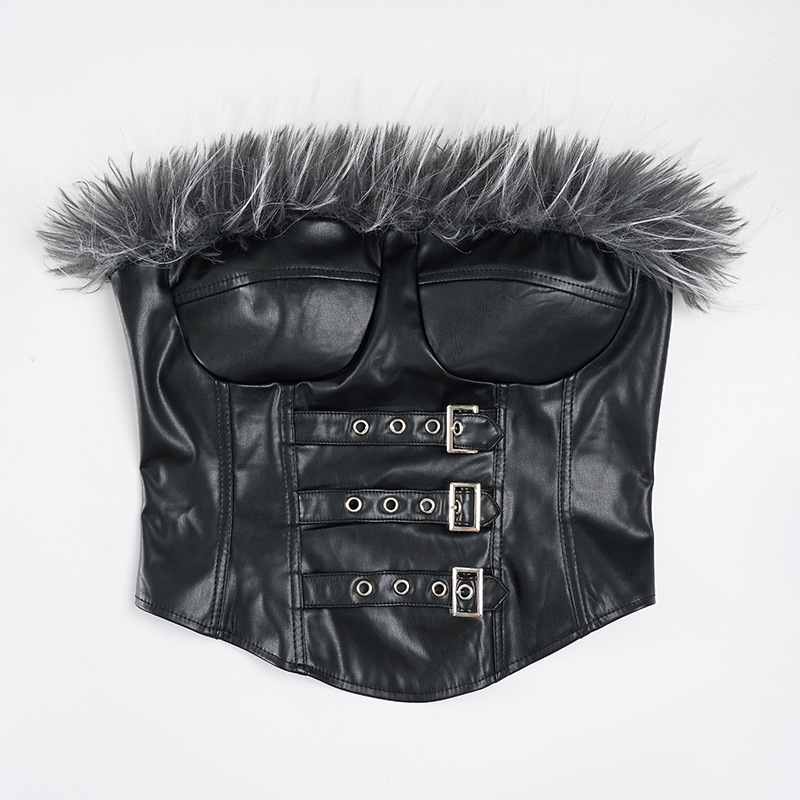 Sexy Mink Collar Leather Bustier with Metal Buckle and Splicing Design, Waist-Cinching Fitted Short Crop Top
