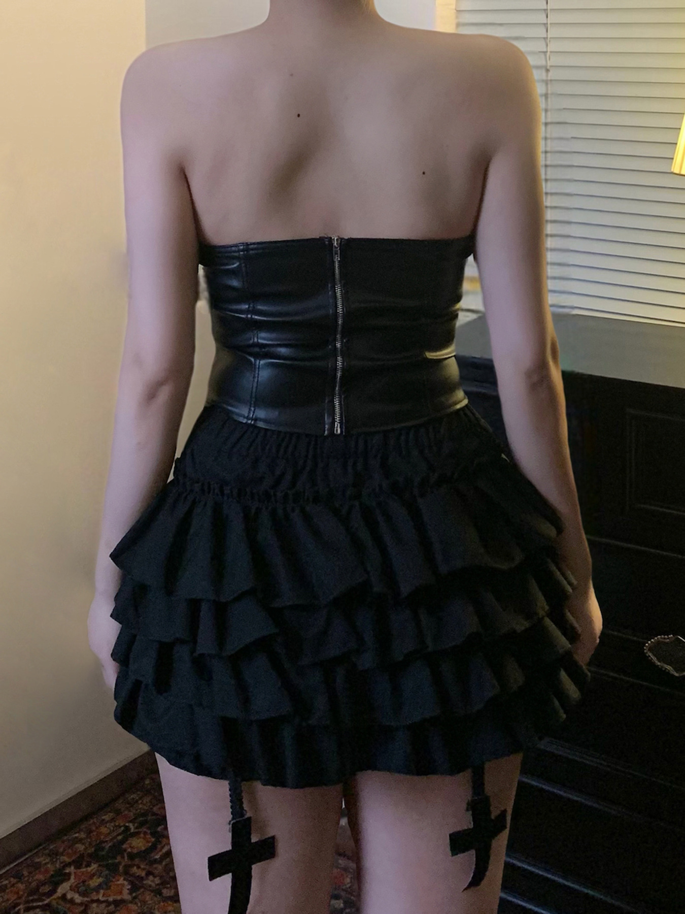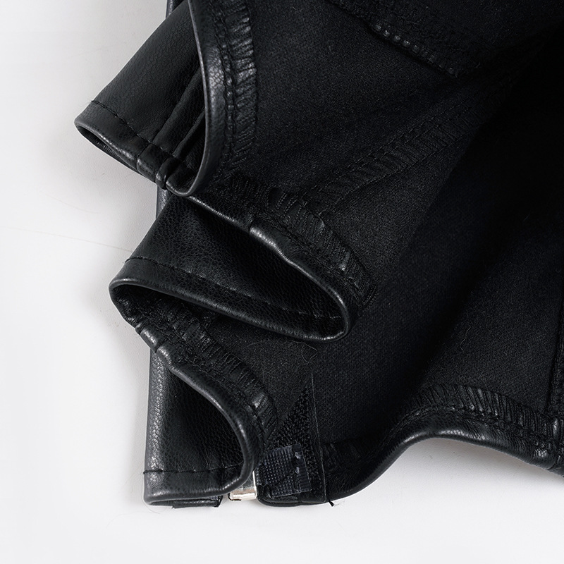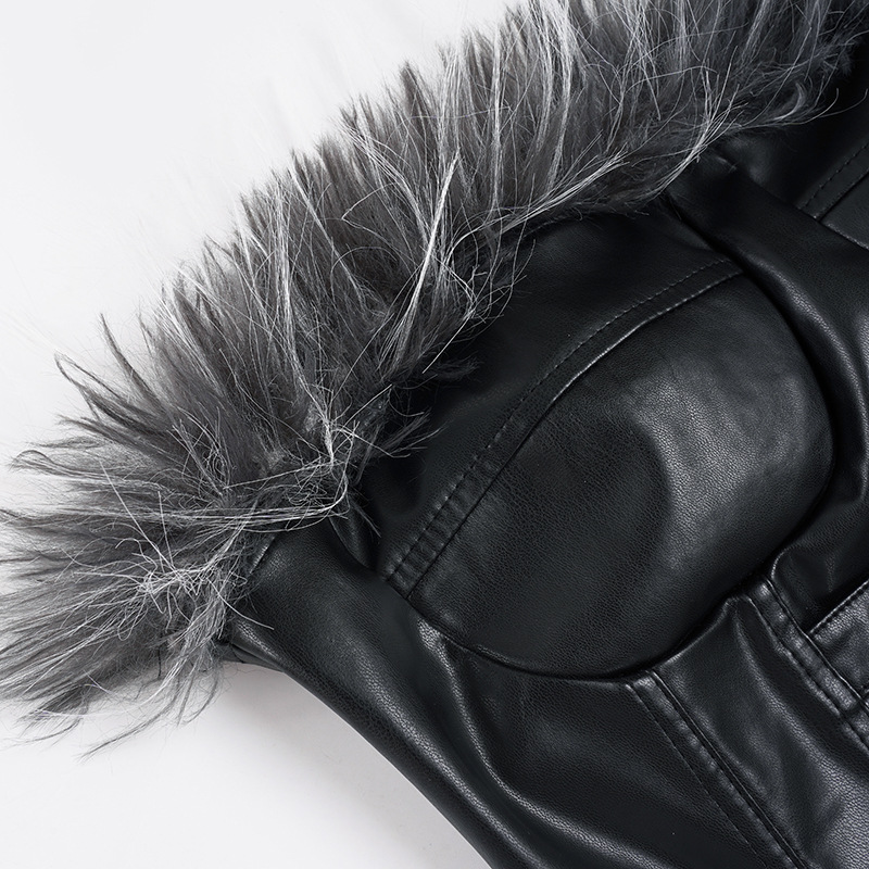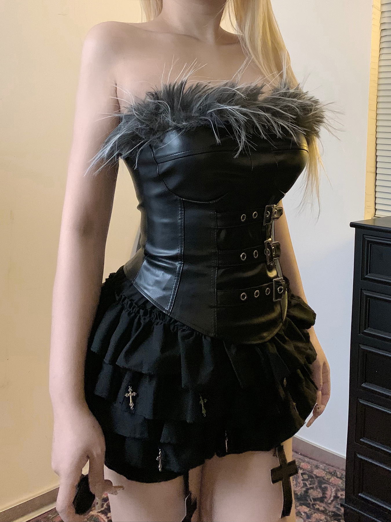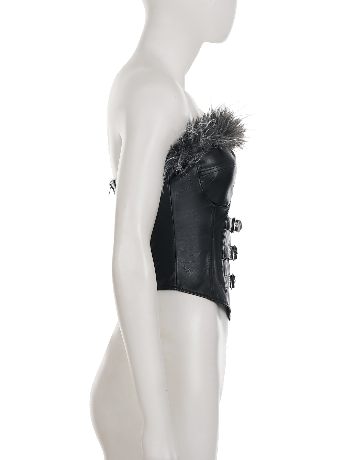 Sexy Mink Collar Leather Bustier with Metal Buckle and Splicing Design, Waist-Cinching Fitted Short Crop Top